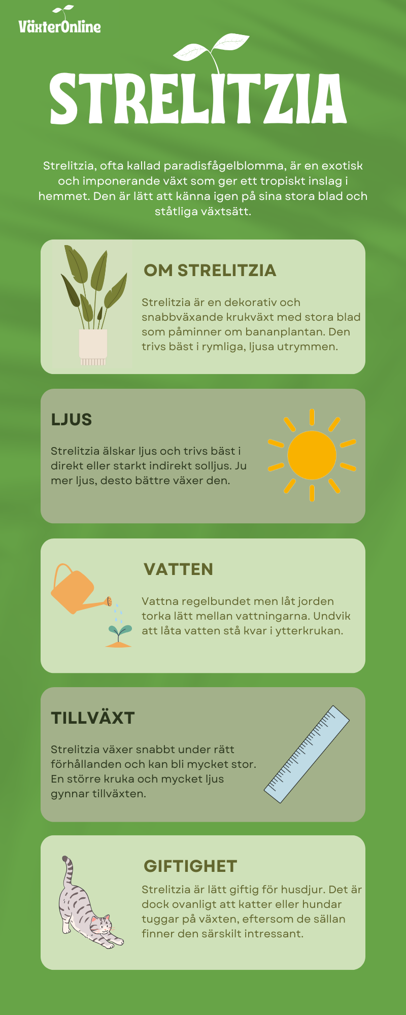 Strelitzia Nicolai är känd för sin snabba tillväxt och sina stora, frodiga blad som påminner om tropiska paradis. Denna växt trivs bäst i ljusa, indirekta ljusförhållanden, vilket gör den idealisk för placering nära ett fönster med mycket naturligt ljus. Med regelbunden vattning och lite kärlek kommer din Strelitzia Nicolai att belöna dig med en frodig grönska som skapar en lugnande atmosfär i ditt hem.